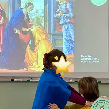 L’atelier met les élèves en posture d’enquêteurs : en manipulant des objets et attributs symboliques, ils apprennent à identifier les personnages clés et à décrypter les scènes. On observe, on compare, on devine, on s’étonne. Et surtout… on retient !